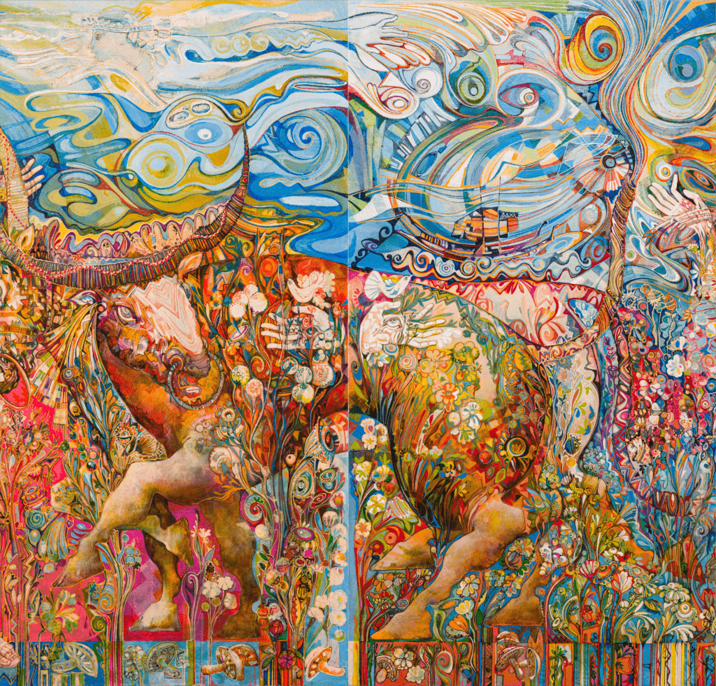 Sergo Tbileli’s painting “Colchis” serves as a multidimensional canvas that weaves together history, legend, and culture, capturing the essence of ancient Western Georgia. The artwork features two metallic-hued Colchian bulls at its heart, calling to mind the Khalkotauroi of Greek mythology, most notably from the Argonautica. In this ancient tale, Jason and the Argonauts journey to Colchis in search of the Golden Fleece, and these fire-breathing bulls play a crucial role in the tests Jason must pass. In Tbileli’s rendition, the bulls are more than mere symbols; they are cultural and mythological anchors, connecting the Colchians’ metallurgical skills with the land’s symbols of strength and fertility. Swathed in a celestial palette of blues, pinks, oranges, and reds, the painting envelops the viewer in a variegated landscape that oscillates between velvety and rugged textures.